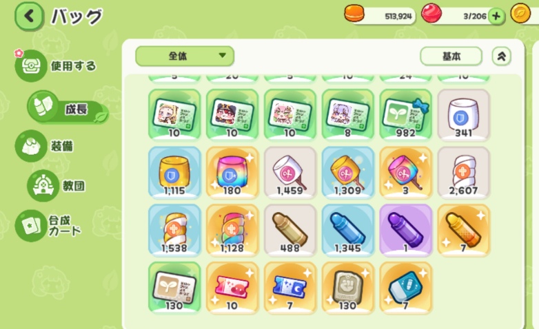 これら紹介した不要アイテムを売却するには、バッグ⇒成長⇒中級クレヨンや中級マシュマロを選択して、個数を選択し、売却をしてみてください。